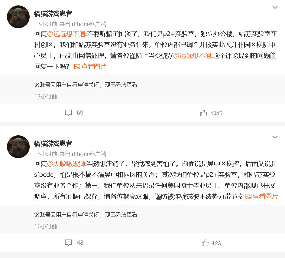 对此,耿直哥在@武知不菜二代目销号的次日,即12月27日这天,先后给他曾宣称自己工作的那两个单位,即苏州工业园区疾病防治中心和苏州吴中区疾控中心去了电话,这两个机构都表示他们已经得知了此事,并且已经经过内部核查确认自己单位没有这个人,他们的单位里也没有P4实验室,与姑苏实验室也没有他所描述的那些测序新冠病毒的合作关系。其中,苏州工业园疾病防治中心表示,他们已经将此事汇报给了当地网信办处理。