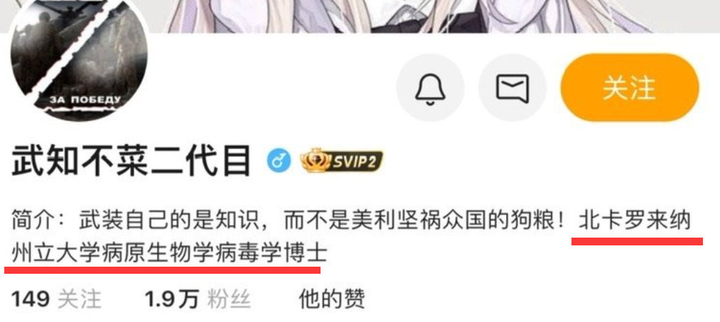 除此之外,@武知不菜二代目还在自己账号的简介里自称自己是美国“北卡罗莱纳州立大学病原生物学病毒学博士”。