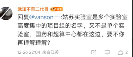 但质疑他的网民又提出了新的质疑,指出姑苏实验室主要是做材料科学项目,怎么会有进行病毒测序的P4实验室?对此,@武知不菜二代目则宣称姑苏实验室是由“多个实验室”组成的,并让质疑他的网民多“理解理解”他的意思。