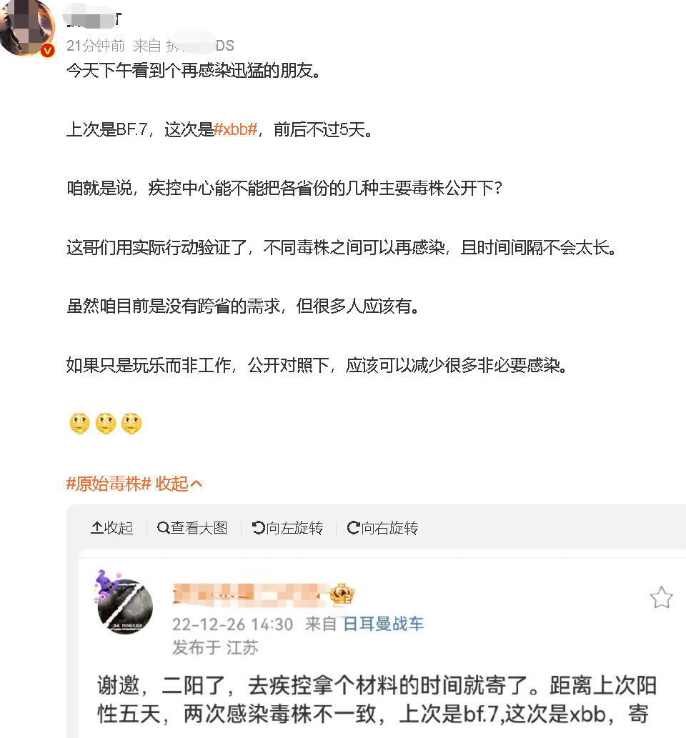 结果,他的这些“背景”,让很多网民——包括微博上很多网络大V,都将他所说的自己“在5天里二次感染两种不同毒株”的说法当真,并进行了转发。不仅他说自己“二次感染”的帖子的转发一度逼近1万,而且还成为了微博平台上最热门的话题之一。