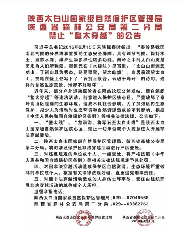 2018年4月16日,陕西太白山国家级自然保护区管理局、陕西省森林公安局第二分局发布禁止“鳌太穿越”的公告。