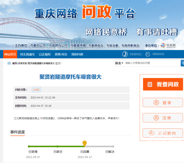 该网友发布时间为2022年4月1日,问政对象为江北区,问政平台在4月27日回复该网友,反映问题已收悉,已转交相关部门进行核实回复,感谢对重庆问政平台支持。