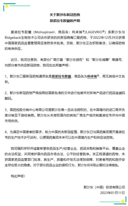 默沙东中国表示,莫诺拉韦胶囊(Molnupiravir,商品名:利卓瑞®/LAGEVRIO®)系默沙东与Ridgeback生物技术公司合作研发的抗新冠病毒口服药物,于2022年12月29日获得中国国家药品监督管理局应急附条件批准。目前,默沙东正在积极备货,以确保药物的有序供应。