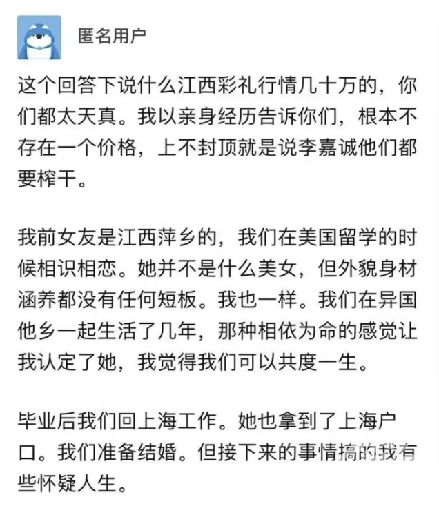 在这条回答中,有上海网友在知乎上发文吐槽称,被江西萍乡前女友提1888万元彩礼引发关注。文中称,他们曾一同留学决定回国结婚,因女方提出天价彩礼,导致最终分手。
