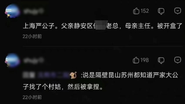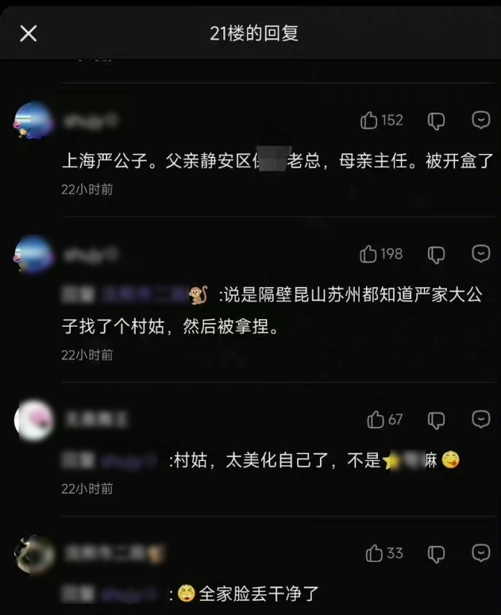 发帖者的身份被迅速扒出,网友称是上海一男子,人称“上海严公子”,父亲是静安区某公司老总。