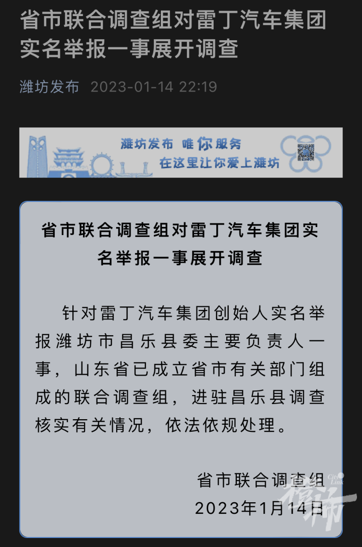 都市快报讯 据“潍坊发布”1月14日晚消息,针对雷丁汽车集团创始人实名举报潍坊市昌乐县委主要负责人一事,山东省已成立省市有关部门组成的联合调查组,进驻昌乐县调查核实有关情况,依法依规处理。
