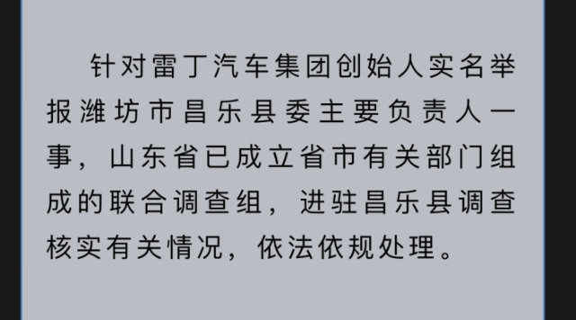 针对雷丁汽车集团创始人实名举报潍坊市昌乐县委主要负责人一事,山东省已成立省市有关部门组成的联合调查组,进驻昌乐县调查核实有关情况,依法依规处理。