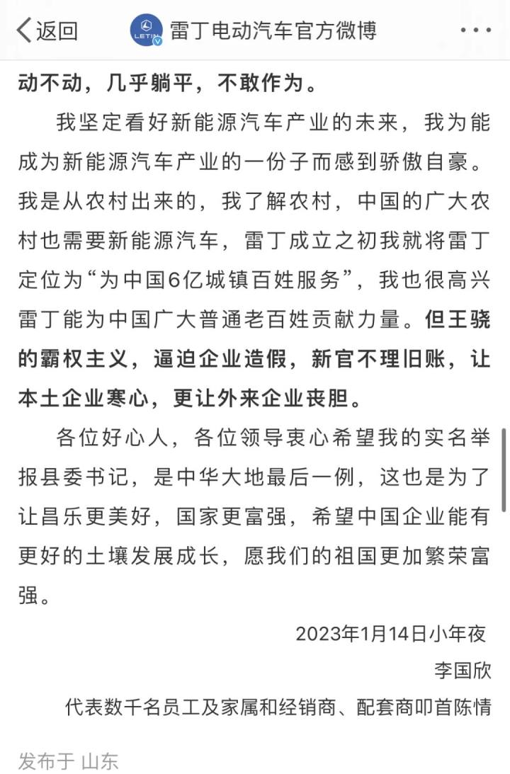 雷丁汽车老板出镜举报县委书记,潍坊回应