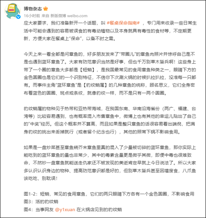 据悉,博物杂志还特别开通了“餐桌保命指南”话题,专门用来收录一些日常生活中可能会遇到的容易被误食的有毒动植物以及本身就具有毒性的食材等,不定期更新,方便大家在餐桌上“保命”,以备不时之需。