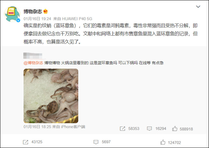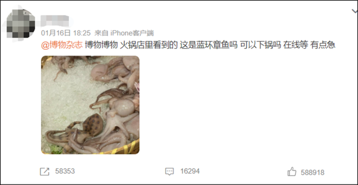 一时间,在日常生活中并不常见的“蓝环章鱼”也成为了网友讨论的热门话题,“蓝环章鱼”、“蓝环章鱼到底有多毒”登上微博热搜第一。部分网友发现自己吃过或买到章鱼身上也有一两个圆环,于是也怀疑自己买到了蓝环章鱼,纷纷发微博询问博物杂志:“这个章鱼身上也有圆圈,是不是就不能吃了?”