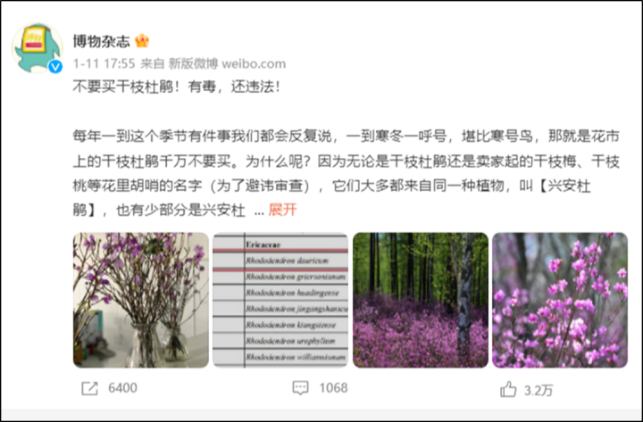 过年期间,还有许多家庭会购买各类年花。博物杂志也在微博发出提醒: