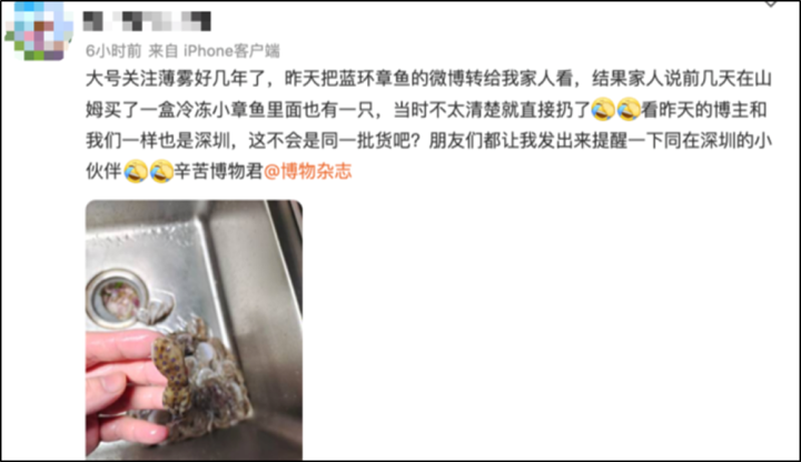 值得注意的是,这两位发现蓝环章鱼的博主都位于广东地区,网友怀疑:“这不会是同一批货吧?”