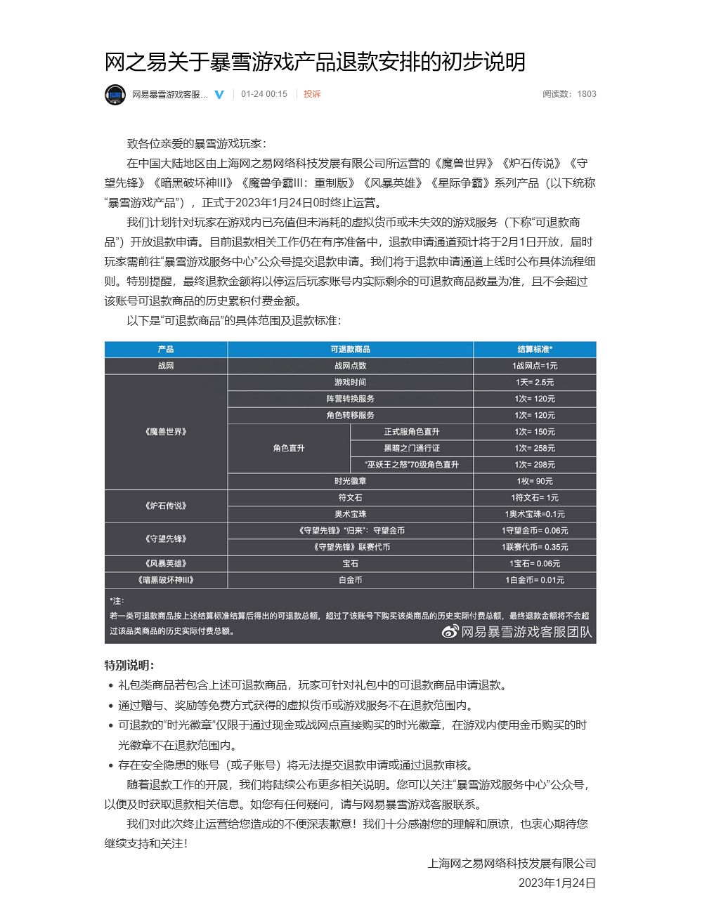 相关暴雪游戏产品正式终止运营后,网易暴雪游戏客服团队于24日凌晨发布《网之易关于暴雪游戏产品退款安排的初步说明》,其中提及计划针对玩家在游戏内已充值但未消耗的虚拟货币或未失效的游戏服务开放退款申请。