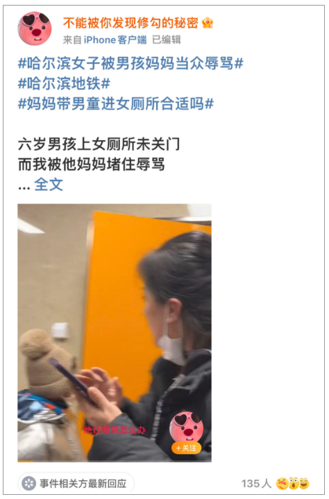 橙柿互动消息 近日,一条视频在社交媒体引起了广泛传播和讨论,事发黑龙江哈尔滨,一6岁男童上女厕所未关门,一女孩质疑却被男童母亲辱骂。