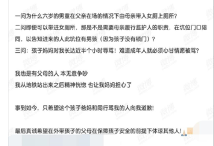 从今天当事人所发视频看,并不清楚现场有没有第三卫生间,如果有,为什么这位妈妈不用,而偏偏到女洗手间来?除了自己方便以外,是不是对第三卫生间的认知也不清楚?
