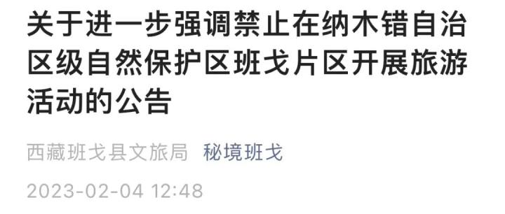 2月4日,班戈文旅局发布《关于进一步强调禁止在纳木错自治区级自然保护区班戈片区开展旅游活动的公告》。全文如下: