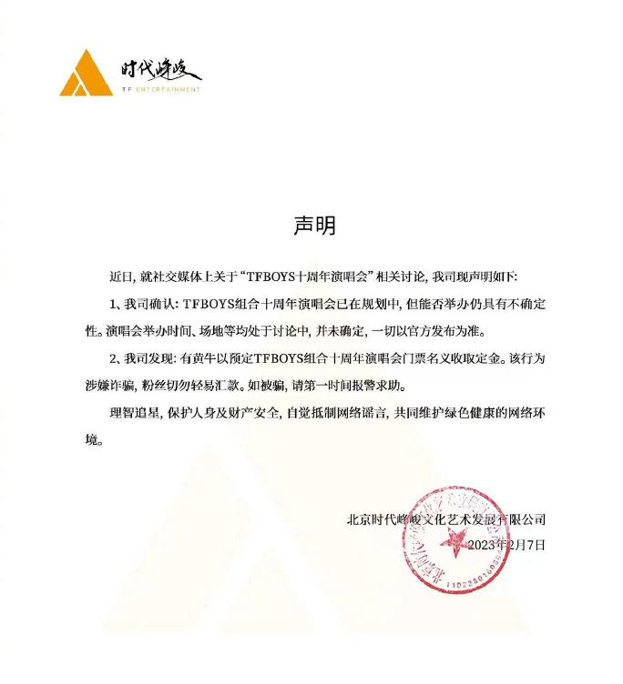 在热搜上盘旋了几个小时后,TFBOYS的经纪公司时代峰峻也终于舍得出来”辟谣“了:待定中,请理智追星。