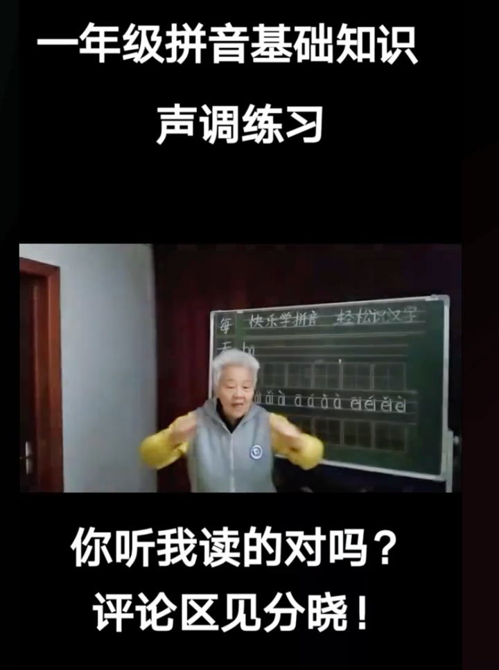 在社交平台上,像小张这样的博主还有很多。例如,73岁的退休教师杨维云奶奶,每天晚上都站在小黑板前,笑盈盈地教成年人识字,也吸引到了几十万粉丝。
