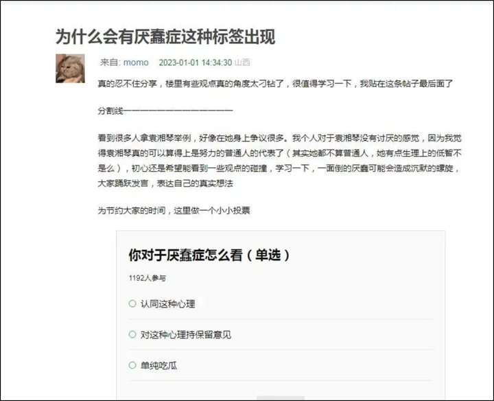 2023年1月1日,网友momo在豆瓣发起话题《为什么会有厌蠢症这种标签出现》,有网友跟帖回应。