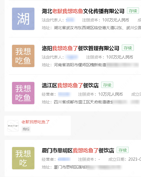 企查查显示:其中湖北老默我想吃鱼文化传播有限公司,成立于2023-02-06,注册资本为100万元人民币,地址位于湖北省武汉市东西湖区。