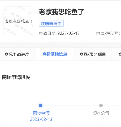 另外,还有自然人正在申请“老默我想吃鱼了”商标,申请日期为 2023-02-13。