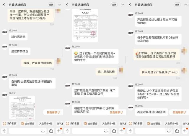 然而,在某电商平台,一家售卖“自嗨锅蒜香花蛤粉”的旗舰店将店内同款产品的宣传图片标注为“标价176万致富款花蛤粉”,页面下方还显示了“蒜香花蛤粉事件情况说明”的图片,内容为“女子疑吃自热火锅后去世”相关报道图片。对此,自嗨锅的客服人员回应称“这不是宣传图”,并表示该描述和图片是对相关事件的“调侃”,是为了让客户更直观地了解事件的真实情况。