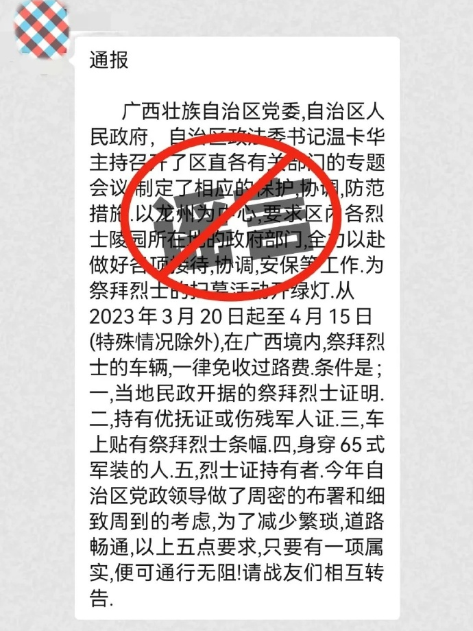 近日,有战友在群里转发:“从2023年3月20日起至4月15日(特殊情况除外)在云南、广西境内祭拜烈士的车辆一律免收过路费”。