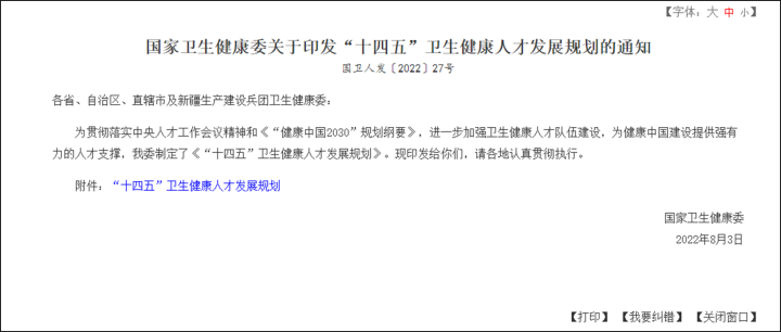 早在2022年8月3日,国家卫生健康委关于印发“十四五”卫生健康人才发展规划的通知中也曾提到:鼓励基层医务人员在政策允许的范围内通过兼职兼薪获取报酬。