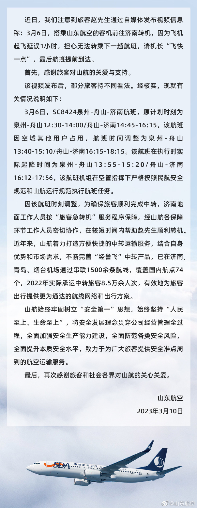 3月10日,山东航空官方微博也更新了一则相关说明。
