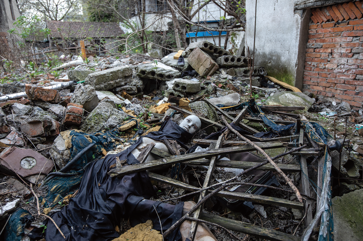 随处可见废弃的医疗设备或生活用品,一个假人头部突然映入眼帘,手里的雨伞一下撑开,“刺”的一声,摔在沾湿的破花棉袄上。