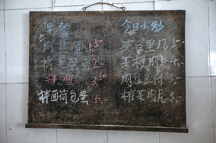 一楼是食堂,共三个窗口,一块当年的菜单牌子至今还没摘下,上面写着“今日小炒”,五块钱的茭白里脊,四块钱的菜梗肉片,三块钱的肉丝豆腐,早餐的性价比也很好,五块钱的肉丝面,五块钱的荷包蛋拌面……