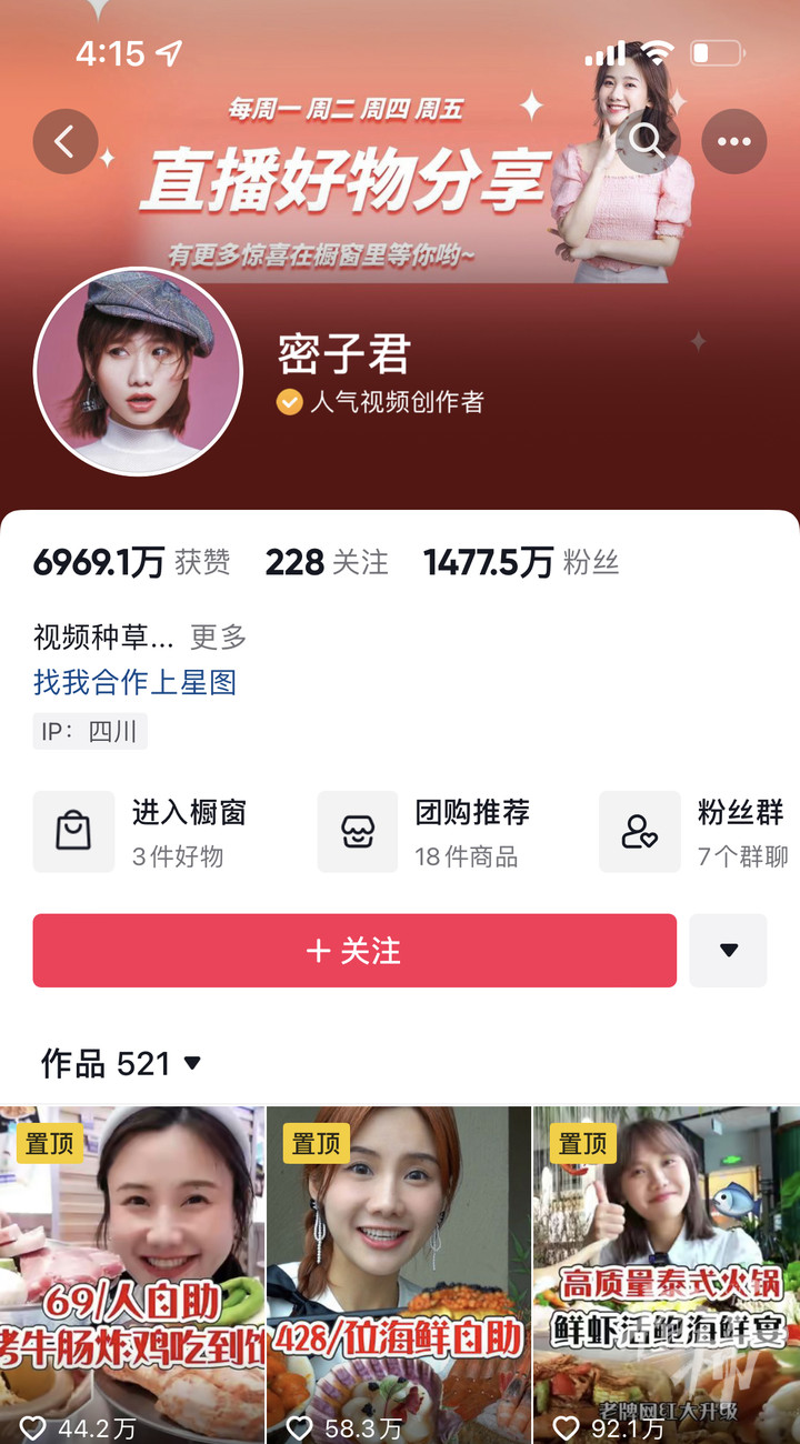 橙柿互动浏览密子君的主页发现,密子君是某平台一名美食博主,拥有1477.5万粉丝。