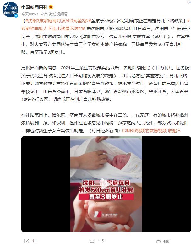 据沈阳市卫健委网站4月11日消息,沈阳市卫生健康委员会、沈阳市财政局日前印发《沈阳市发放三孩育儿补贴 实施方案(试行)》。方案提出,对夫妻双方共同依法生育三个子女的本地户籍家庭,三孩每月发放500元育儿补贴,直至孩子3周岁止。