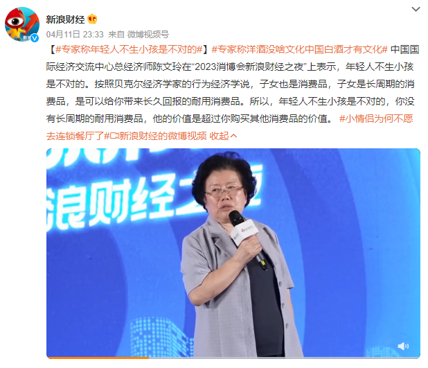 陈文玲表示,按照贝克尔经济学家的行为经济学说,子女也是消费品,子女是长周期的消费品,是可以给你带来长久回报的耐用消费品。所以,年轻人不生小孩是不对的,你没有长周期的耐用消费品,他的价值是超过你购买其他消费品的价值。