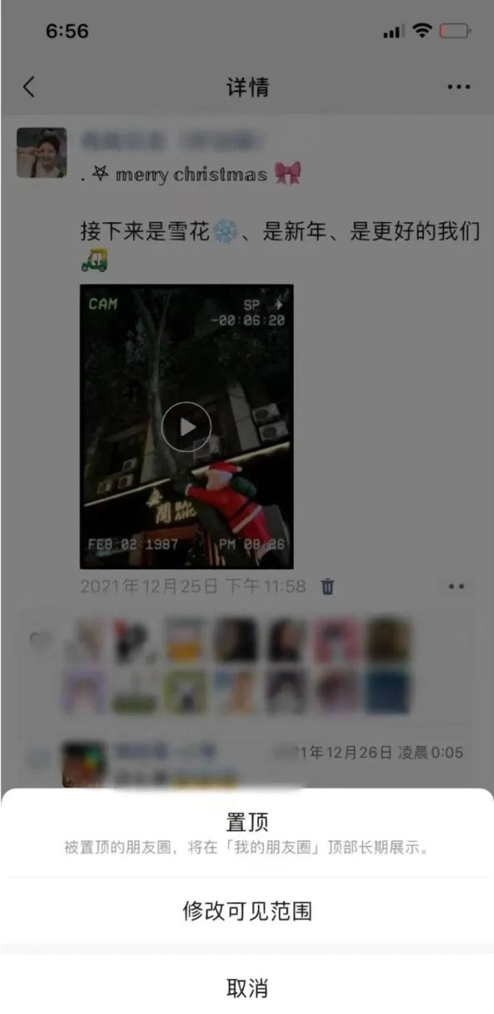 点击朋友圈右上角的“...”,便能看到“修改可见范围”上面多出个“置顶”按钮。