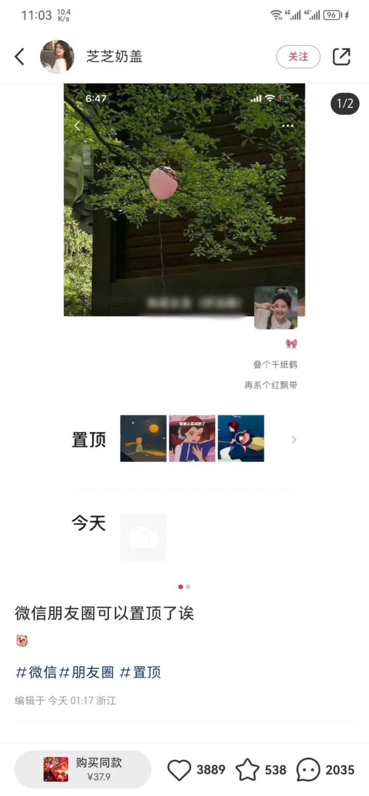 事情是这样的,4月14日凌晨小红书一位博主发帖称,自己微信朋友圈支持置顶功能,可以将某条朋友圈长期在个人页面顶部显示。