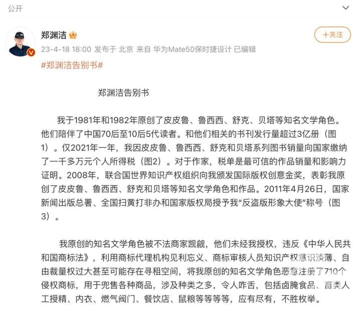 4月18日,作家郑渊洁在微博上发布“告别书”,称因对商标维权丧失信心,将告别商标维权,不再对侵犯其原创的知名文学角色的673个侵权商标维权。