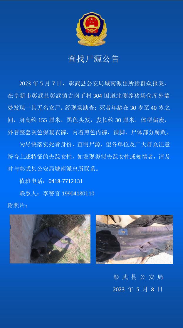 2023年5月7日,彰武县公安局城南派出所接群众报案,在阜新市彰武县彰武镇吉岗子村304国道北侧养猪场仓库外墙处发现一具无名女尸。经现场勘查: 死者年龄在30岁至40岁之间,身高约155厘米,黑色头发,发长约30厘米,体型偏瘦外着整套灰色保暖衣裤,内着黑色内裤,裸脚,尸体部分腐败。为尽快落实死者身份,查明尸源,望各单位及广大群众注意符合上述特征的失踪女性,如发现类似失踪女性或知情者,请及时与彰武县公安局城南派出所联系。