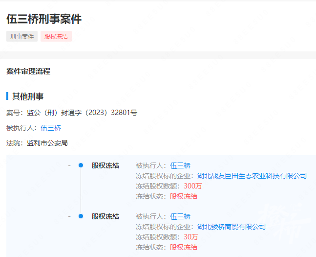 随着伍三桥落网,其掌握的公司也被警方冻结了股权。网站显示,湖北战友巨田生态农业科技有限公司、湖北骏桥商贸有限公司因“伍三桥刑事案件”分别被监利市公安局冻结股权300万元与30万元。