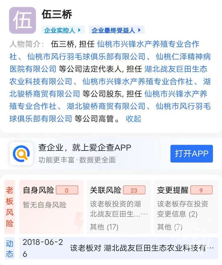 在爱企查上搜索伍三桥的名字,橙柿互动发现,这个伍三桥,先后担任仙桃市兴锋水产养殖专业合作社法人、股东、高管,仙桃市风行羽毛球俱乐部有限公司法人、高管,仙桃仁泽精神病医院有限公司法人,湖北战友巨田生态农业科技有限公司股东,湖北骏桥商贸有限公司股东、高管。从公司名字来看,伍三桥的涉猎范围,还挺广泛。