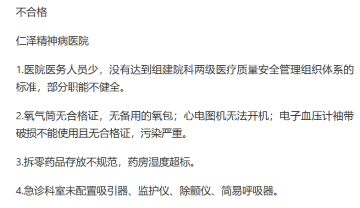 这家精神病医院,在去年5月仙桃市卫生健康委组织医疗、护理、药学等20名专家对全市民营医疗机构医疗质量的督导检查工作中被评为不合格,得分只有17分(满分100)。
