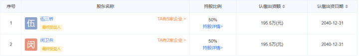 而同在名单上的闵卫兵,与伍三桥共同担任仙桃仁泽精神病医院有限公司股东,二人各持有股份50%,认缴出资额均为195.5万;除此之外,他还是仙桃市速修科技有限公司法人、股东与高管。
