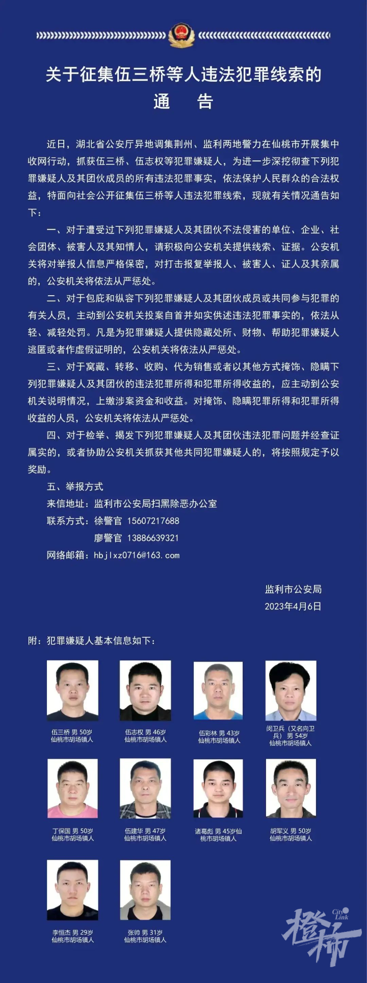 橙柿互动注意到,早在4月6日,监利市公安局就发布了《关于征集伍三桥等人违法犯罪线索的通告》,伍三桥、伍志权等犯罪嫌疑人也被荆州、监利两地警力联手抓获。