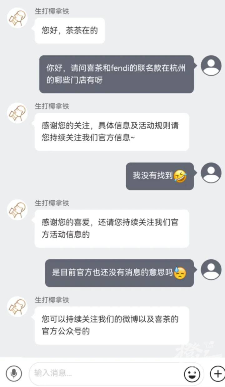 但喜茶官方却搞起了“神秘感”,没有透露出任何确切消息,昨天我在喜茶小程序上找了人工客服,本来是想知道杭州有哪些喜茶门店参与联名款发售,到时候可以过去下单,但客服的嘴可以说是非常严实了:“请关注喜茶官方信息哦”。