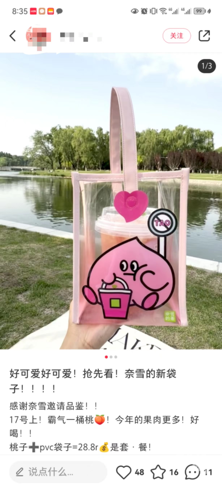 其实同样在5月17日发售的,除了喜茶和Fendi的联名款,还有奈雪的茶和乐乐茶,奈雪的茶在今天推出了一桃桶·PVC桶包套餐,1L装的蜜桃冰沙搭配一个粉色系PUV桶包,只需要28.8元。