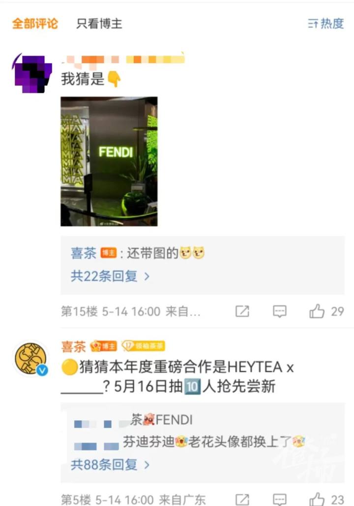 在5月14日的微博下方,也有人第一时间猜出了喜茶联名的对象是Fendi。