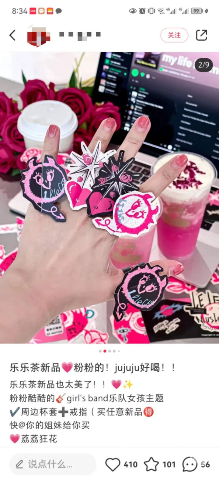 乐乐茶买新品荔荔狂花送girls band乐队女孩主题周边杯套和纸戒指。