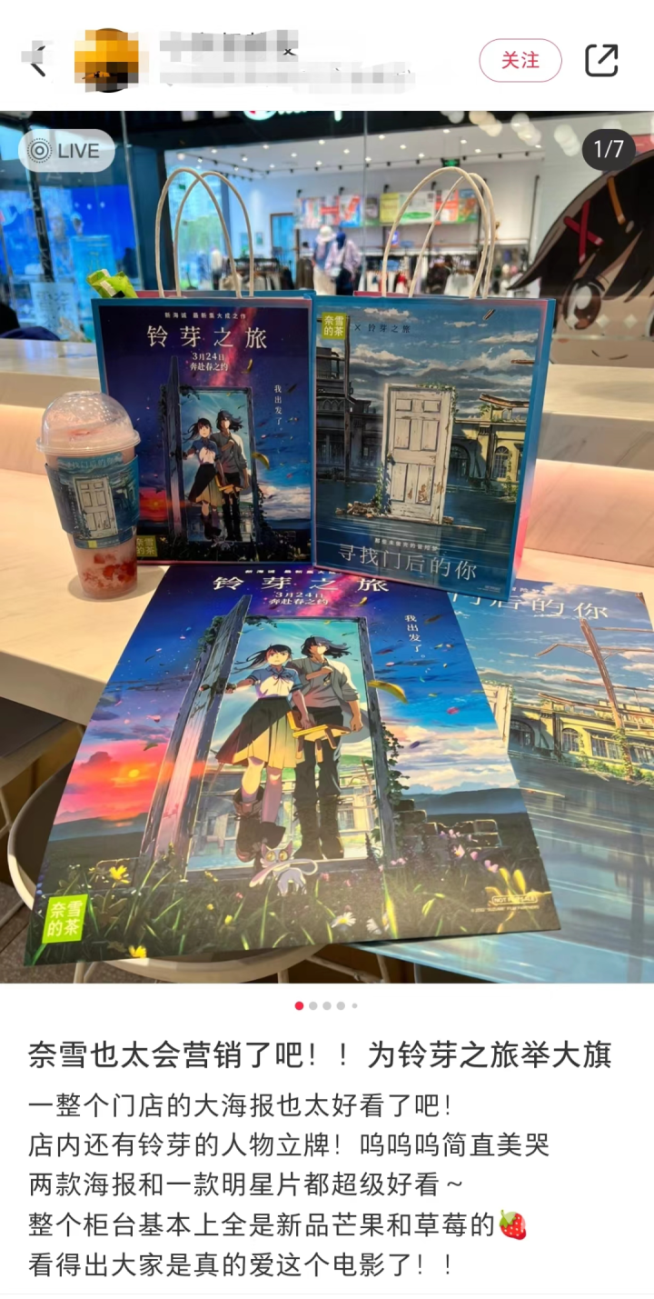 茶百道在4月份跨界和周大福出了联名款,coco和著名IP间谍过家家出的联名被很多粉丝疯狂追捧。奈雪的茶和《武林外传》、《铃芽之旅》、《中国奇谭》等多个知名影视IP都出过联名款。