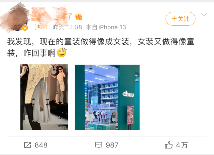 该网友说:“我发现,现在的童装做得像成(人)女装,女装又做得像童装,咋回事啊?”文末出现了三个问号的表情。