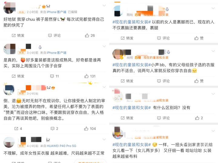 有网友纷纷在下面留言:“好夸张,现在小女童装感觉一点都不可爱,他们是可爱的小朋友呀!好多成熟的大人款式真的看不懂。”“确定图片没有反吗?第二个真的不是童装?我儿子穿都觉得短了,上衣穿130码长度在50左右。”也有网友开玩笑回复说:“以后跟别人说,没想到吧,我穿的是童装啊,骄傲自己身材好,还能穿童装。”“以前的女人都是裹脚而已,现在的人不仅裹脑还要裹腰,裹腿。”